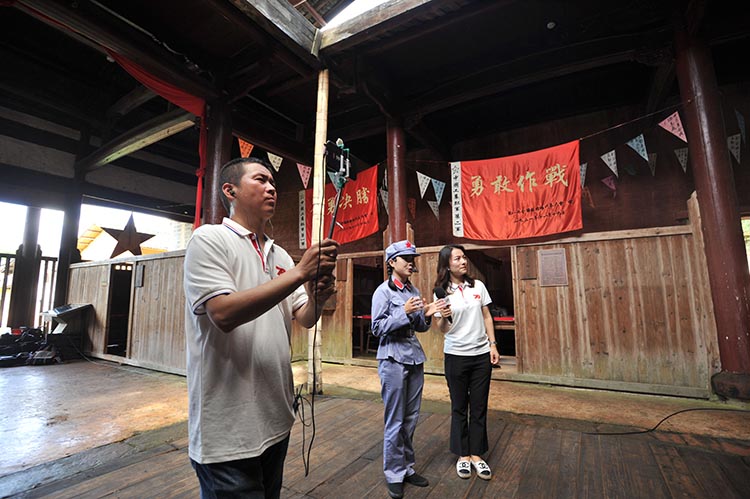 6月11日,参加“记者再走长征路”主题采访活动的记者在江西瑞金叶坪革命旧址群采访。