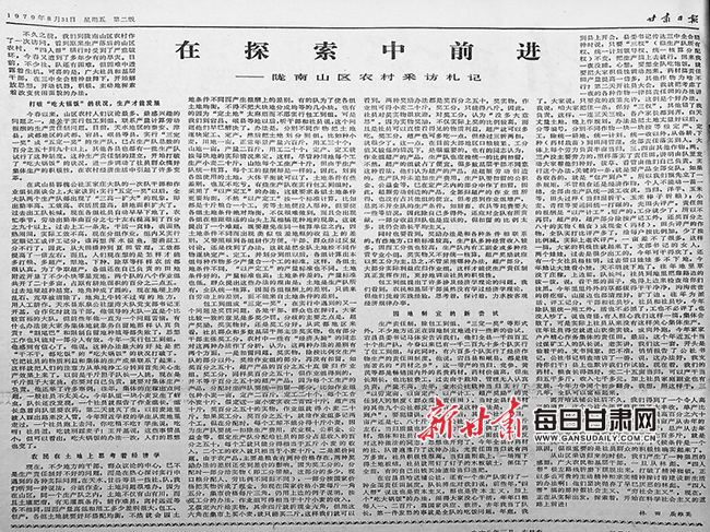 1979年春天,正当哈达铺公社各生产队热火朝天搞“责任田”的时候,社会上出现了对“责任田”的不同看法和议论。正在大家提心吊胆的时候,《甘肃日报》于8月31日刊登新华社记者采写的调查报告《在探索中前进——陇南山区农村采访札记》,让广大农民坚定了继续发家致富的信心。