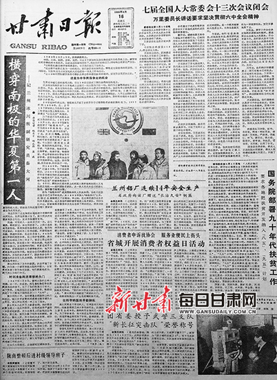 1990年3月16日,《甘肃日报》一版头题刊发长篇通讯《横穿南极的华夏第一人》,聚焦报道了中国科学院兰州冰川冻土研究所研究员秦大河徒步穿越南极的先进事迹。秦大河勇攀世界科学高峰的奋斗精神在社会各界引起了极大的反响,激励着一代又一代青年科技工作者刻苦钻研、奋发有为。