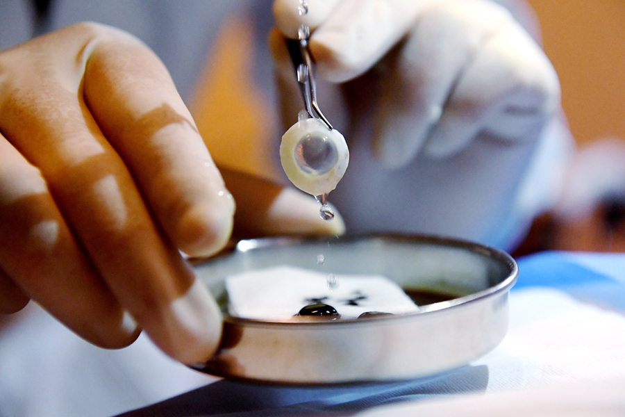 一番鞠躬告别,大家的眼角都湿润了。屈医生镇定情绪,拿出手术刀快速将眼角膜取好,用冰袋保存。“只有快才能保证细胞数量。”屈医生说。