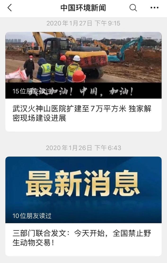 迅速传达党中央国务院声音。1月26日,“中国环境新闻”微信公众号发布《习近平主持中央政治局常委会会议 研究疫情防控工作 党中央成立应对疫情工作领导小组》《三部门联合发文:今天开始,全国禁止野生动物交易》;1月28日刊发《中共中央印发〈关于加强党的领导、为打赢疫情防控阻击战提供坚强政治保证的通知〉》等,将党中央、国务院的声音迅速传递给广大受众。