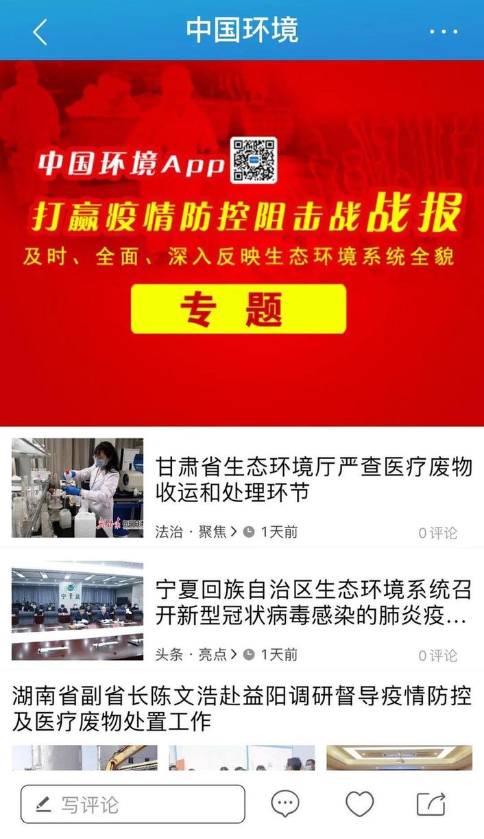 及时报道生态环境部决策部署。在“中国环境新闻”微博微信、“中国环境”APP、中国环境网、头条号等平台同步推出相关报道。如1月23日刊发《生态环境部召开部长会议研究部署肺炎疫情防控相关环保工作》《生态环境部及时部署肺炎疫情医疗废物环境管理工作》;1月29日刊发《生态环境部党组认真落实习近平总书记重要指示精神和党中央国务院决策部署,做好医疗废物处置等工作,为打赢疫情防控阻击战提供支撑保障》《如何及时、有效、高效、无害化处置肺炎疫情医疗废物?生态环境部印发指南》;1月31日刊发《生态环境部研究部署全力支撑保障打赢疫情防控阻击战的相关环境保护措施》《生态环境部印发应对新型冠状病毒感染肺炎疫情应急监测方案》等文章。