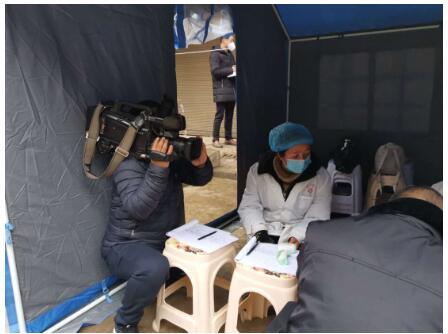 2月2日晚,云南昭通广播电视台记者彭永义(中)、王传清(左)在云南省昭通市鲁甸县茨院回族乡卫生院采访。