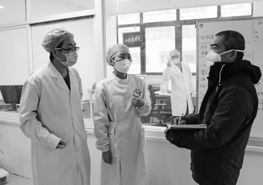 2月2日上午,《大众日报》记者王凯(右一)在湖北省黄冈市大别山区域医疗中心感染病房,采访山东省第一批援鄂医疗队。大众日报社 供图