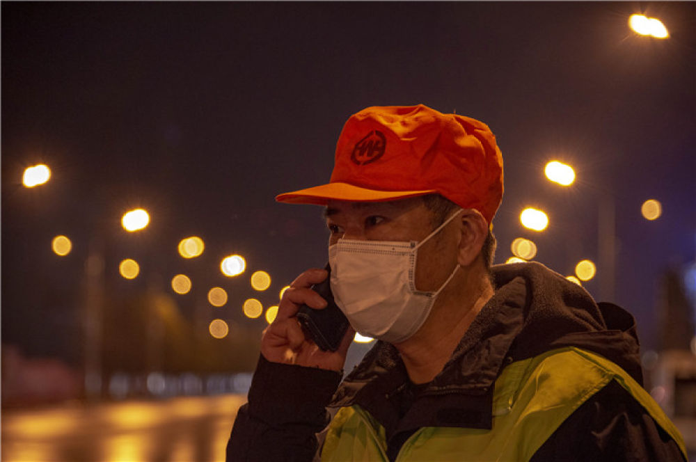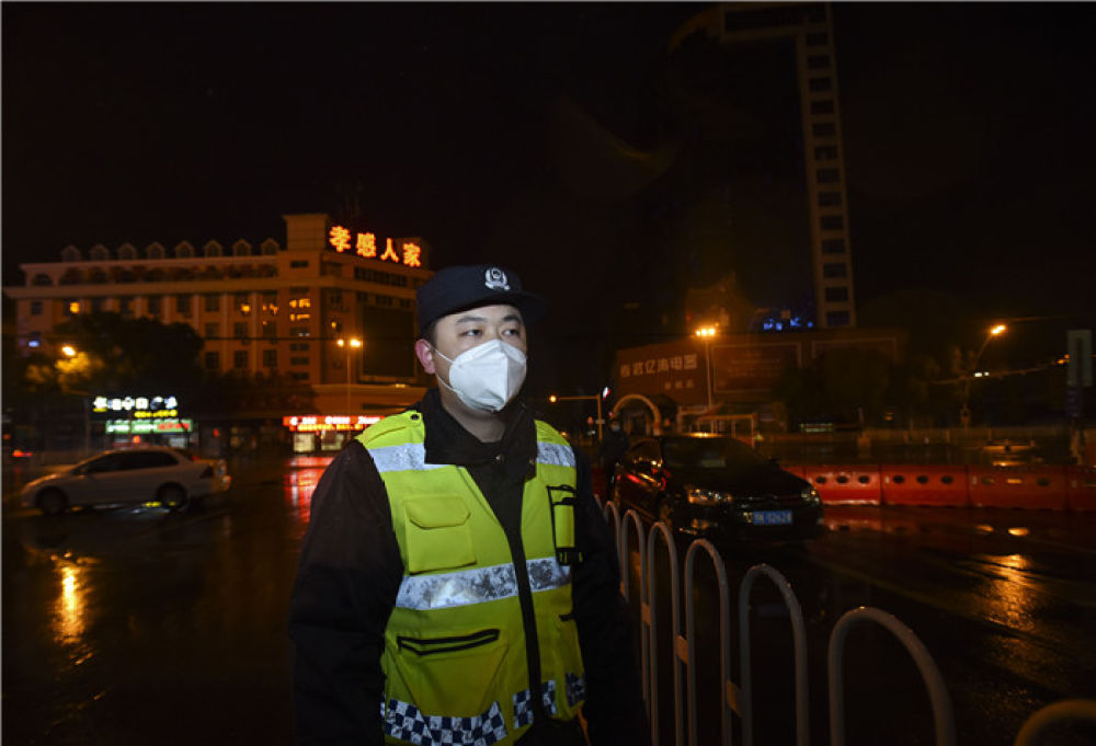 2月6日,孝感市城市管理综合执法支队直属三大队的饶平伍在孝感市城区的一处疫情防控检查点值守。新华社记者 胡虎虎 摄