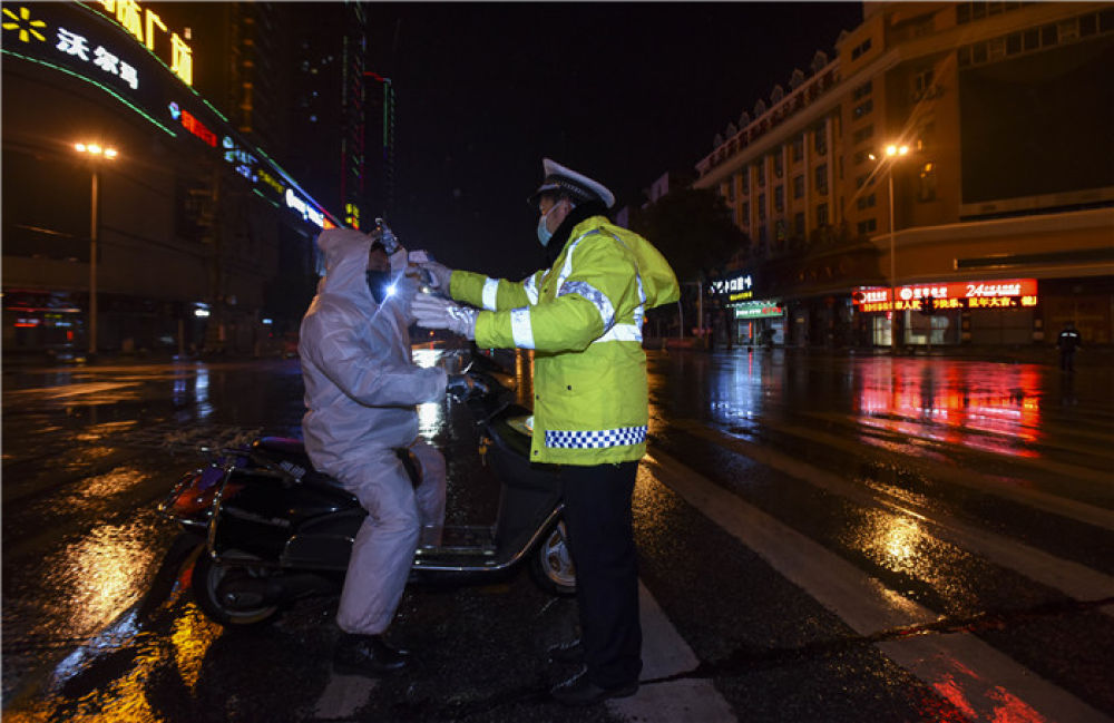 下午5点50分,孝感,到了。出高速孝感东收费站就是检查点,登记人员信息、测量体温……执勤民警说,现在只有运送防疫物资、生活保障物资、医护人员的车辆和相关公务车辆等可以通行。我们也看到,很少有车辆在路上行驶。