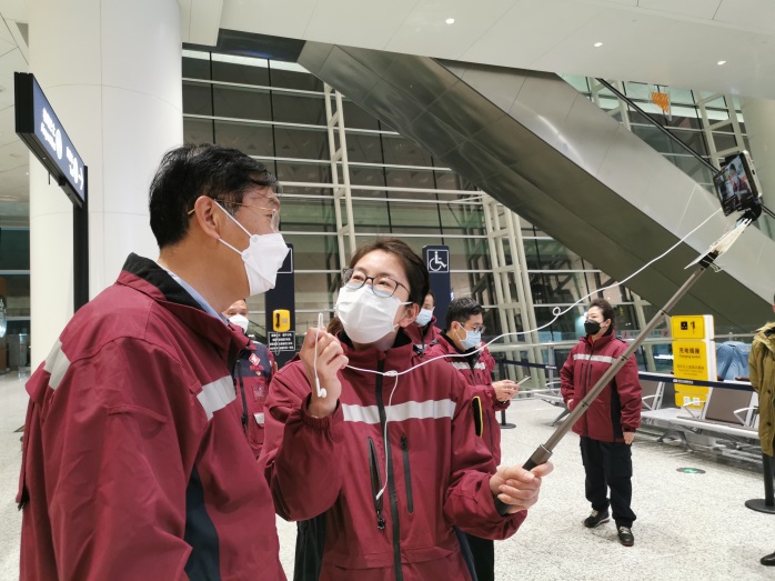 走出住院处大门,刚要返回驻地,5楼的重症病房来了电话,有一位患者病情不稳定需要插管。王洪亮医生立即转身上楼,我悄悄跟在他的身后。回到病房,他马上和值班医生核对患者的情况,并且先派出一组值班护士进入病区,把患者的最新情况用手机发给他,他要综合评估后给出最优诊疗方案,气管插管需要准备的仪器设备和前期工作非常复杂,他要在清洁区做好充足的准备,才能进入病区处置,我暗暗地为他捏了一把汗。尽管这只是他日常工作的一项,技术层面他非常娴熟和自信,但是对新冠肺炎适应症的评估,他却非常地谨慎。