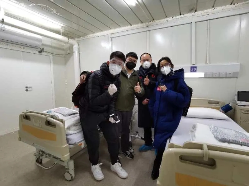 人民日报社记者温腾、鲜敢、汪晓东、张意轩(自左向右)在武汉火神山医院现场。