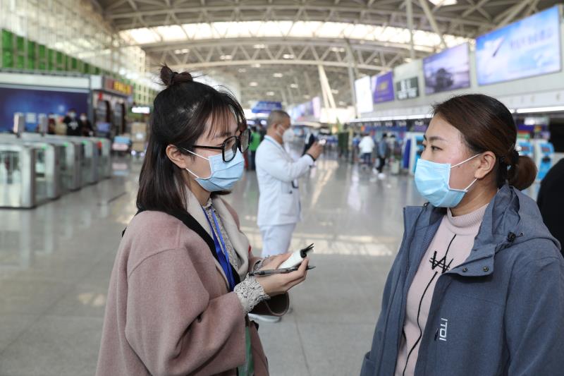 大众日报社记者常青(左)在济南遥墙机场采访即将奔赴武汉的山东援助湖北医疗队队员。