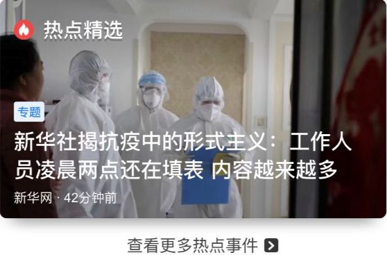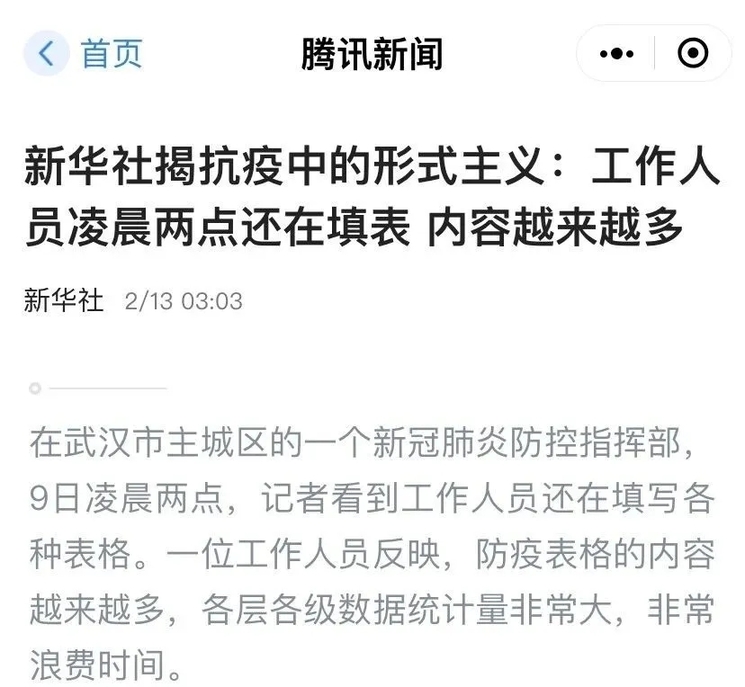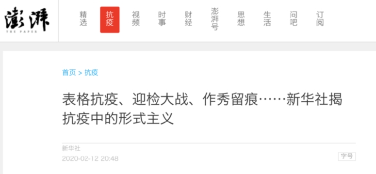 2月12日,新华社“新华视点”栏目播发了《表格任务重如山、聚集动员喊口号、作秀留痕走过场……揭一揭抗疫中的“形式主义”》一文。该报道是主流媒体中第一篇对形式主义进行系统性监督的深度调查报道,产生了强烈社会反响,彰显了国家通讯社在疫情防控大局下,勇于直面问题的政治担当和社会责任感。