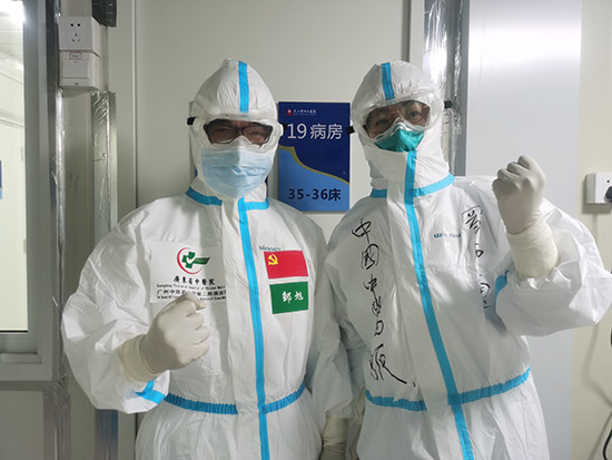 3月1日罗乃莹(右)在雷神山医院感染三科六病区采访广东中医医疗队
