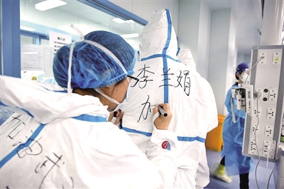 2月20日,助手在李兰娟院士的防护服上写下姓名。中新社记者安源摄