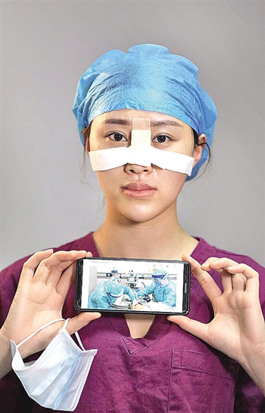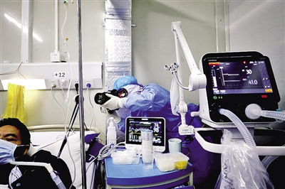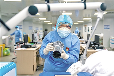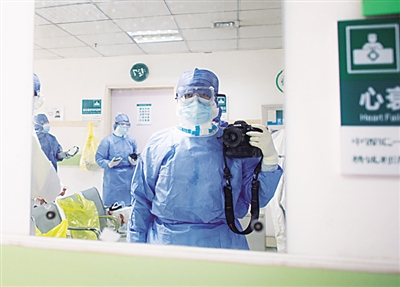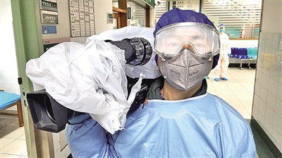 中央广播电视总台摄像记者李志贵在华中科技大学同济医院抢救室采访。文永毅摄
