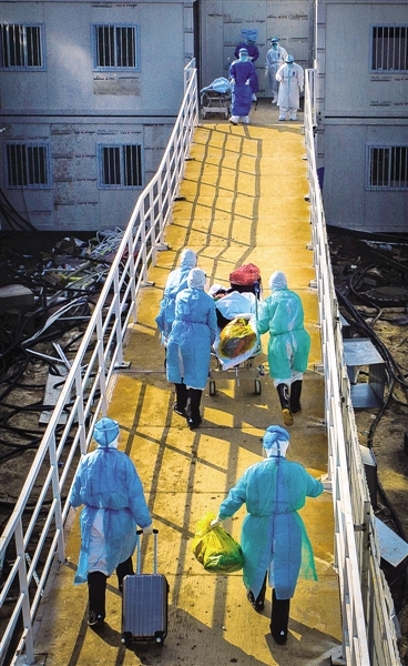 2月4日,火神山医院开始收治新冠肺炎确诊患者,医护人员将患者送入病房。新华社记者肖艺九摄