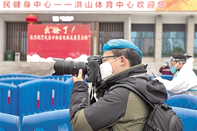 经济日报记者高兴贵在武汉洪山体育馆武昌方舱医院采访。潘松刚摄