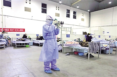 中国日报记者朱兴鑫在武汉客厅方舱医院拍摄。刘颖摄