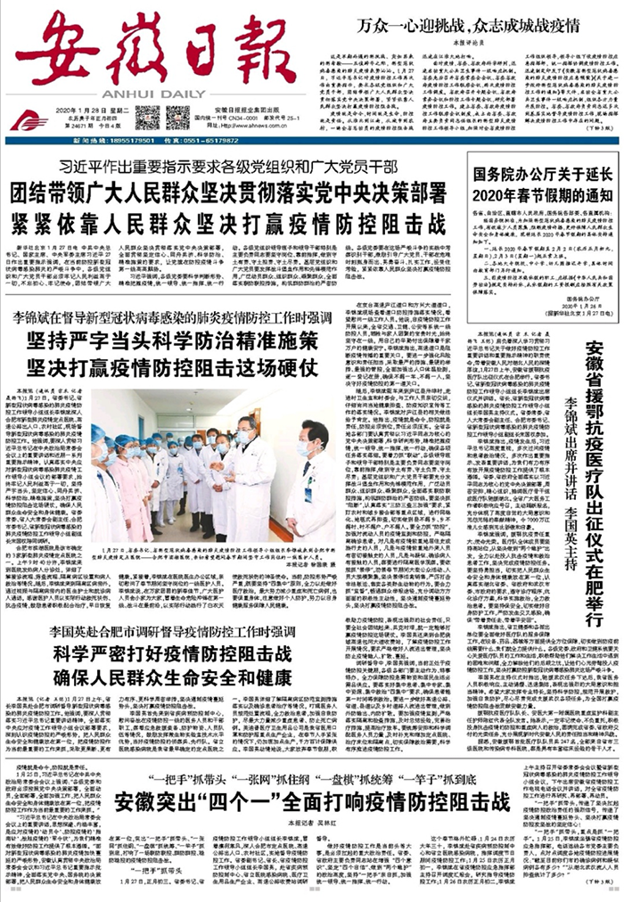 1月28日,安徽日报在头版以通栏版式,推出疫情防控首篇特别报道《安徽突出“四个一”全面打响疫情防控阻击战》,文章站在增强“四个意识”、坚定“四个自信”、做到“两个维护”的政治高度,强调做好疫情防控工作是当前头等大事,是必须扛起的重大政治责任。