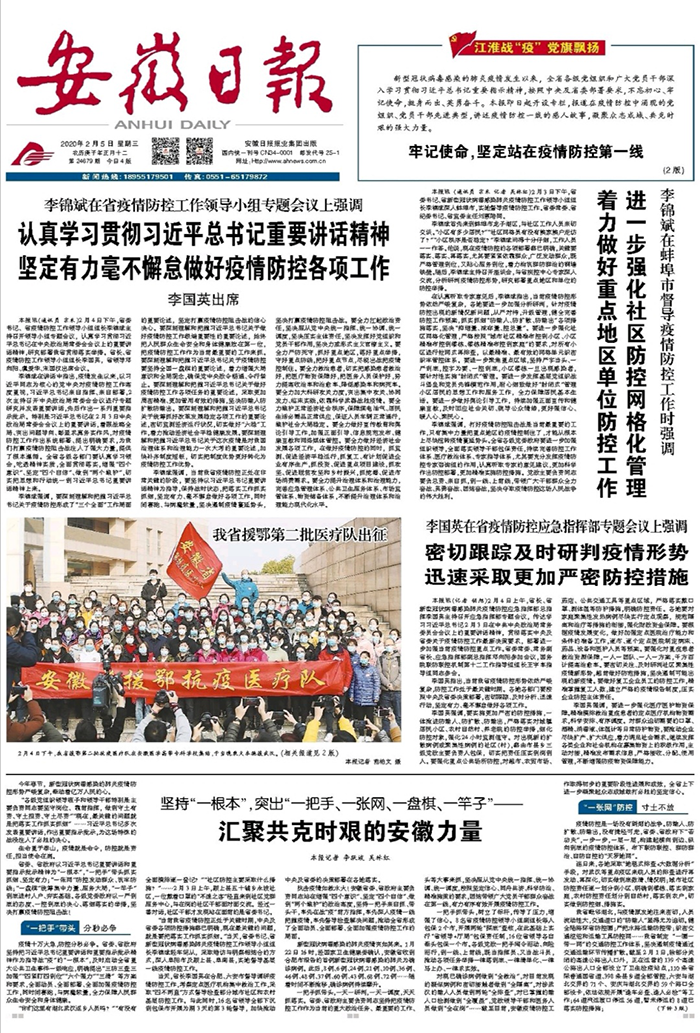 新冠肺炎疫情发生以来,安徽日报牢记党报职责使命,围绕疫情防控重点策划系列特别报道。自1月28日起陆续推出《安徽突出“四个一”全面打响疫情防控阻击战》《汇聚共克时艰的安徽力量》《同时间赛跑 与病魔较量》等报道。系列报道高站位谋划、大视野观照、精细化推进,为打赢疫情防控阻击战持续振奋精神、凝聚力量。