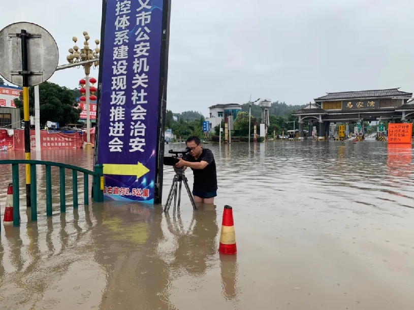 6月14日,贵州省遵义市遭受持续强降雨,城区多地发生洪涝灾害,遵义市广播电视台记者前往一线报道救灾抢险情况,图为记者陈春江在遵义市马家湾收费站处采访拍摄,所拍素材被当日央视新闻联播的联播快讯采用。张驰 摄