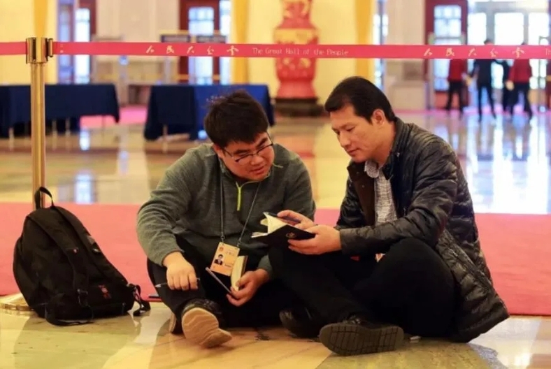 中国教育报刊社记者禹跃昆(左)在人民大会堂两会采访现场和同事研究选题。