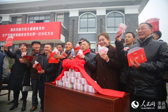 2月9日,重庆市渝北区大盛镇青龙村张灯结彩、喜气洋洋——不光因为春节即将来临,更是因为青龙村生产互助农业股份合作社举行第一次分红大会。合作社“股东”依次上台领取分红,一手拿着股权证,一手拿着大叠现金,每个人脸上都乐开了花。