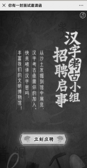 《汉字考古小组招聘啦,快来试试!》本是为纪念国际博物馆日推出的策划,却并没有以介绍某一家或者某几家博物馆为主题,这一策划受到欢迎,也给媒体朋友们提了个醒:面对节日策划,不妨跳出节日的字面意思,去深入探究节日、纪念日的内核,结合读者需求和时代热点进行符合新媒体传播特点的策划,这样更有可能更受到读者的欢迎。(隋明照)