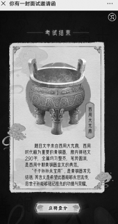 另外,这一互动产品中解释说明的出现位置也恰到好处,读者在测试结束后,可以通过页面解释了解到文物的历史价值和艺术价值。比如“鼎”的测试结束后,显示的介绍页写道:“题目文字来自西周大克鼎,西周时代极为重要的青铜器,腹内铸铭文290字,全篇均匀整齐,笔势圆润,是西周中期青铜器金文的典范。”读者刚刚辨认完古文字,这样的介绍能让读者更有兴趣了解,也能激发读者了解更多文物故事以及走进博物馆的兴趣。