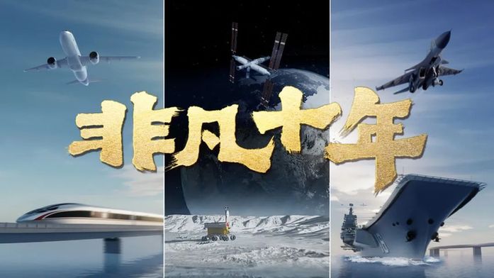 打开《非凡十年》,网友以第一视角穿梭在时空之中,重温为了更加美好的生活而不断奋斗的十年历程。C919大型客机翱翔蓝天,拉开了动画大片的序幕,“非凡十年”中国奇迹的旅程由此开启。镜头从晴空切入碧海,辽宁舰劈波斩浪,一架舰载机腾空而起,“奋斗者”号潜入深海,视角旋即切换到浩瀚的太空,“玉兔号”在月球上缓缓前行,“天问一号”在执行火星探测任务,中国空间站在离地400多公里的轨道上飞行。在中国空间站飞越过祖国上空时,“一带一路”的字幕亮起,视线拉回地球。