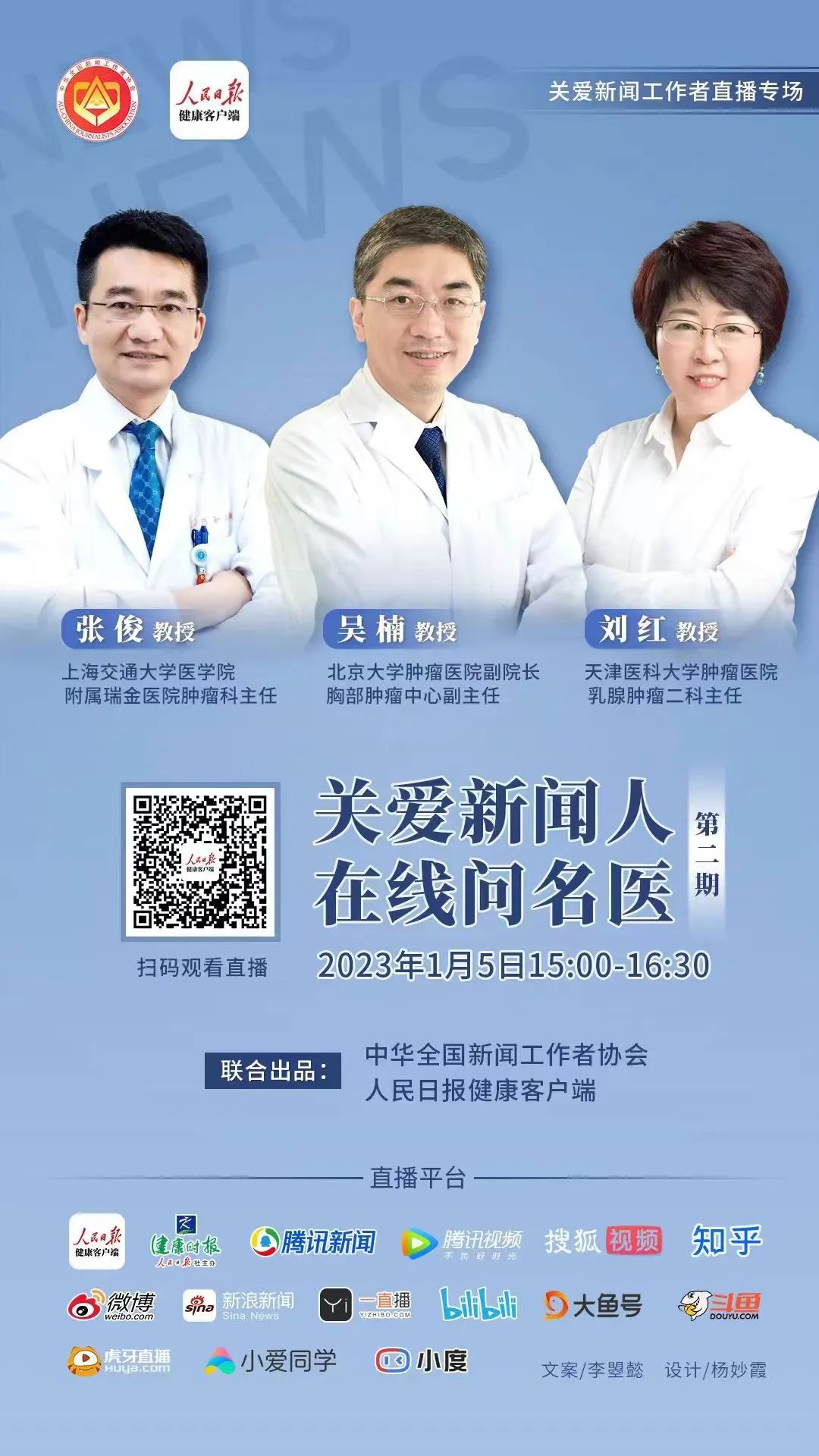 为贯彻落实习近平总书记关于中国记协要真正建设成为“记者之家”的重要指示精神,关爱广大新闻工作者身心健康,中国记协联合人民日报健康客户端,将于2023年1月5日下午3时举办关爱新闻工作者健康在线讲座暨第101期记者大讲堂活动、人民日报健康客户端“关爱新闻人、在线问名医”公益活动,为广大新闻工作者开通向权威医疗专家问诊就医的线上绿色通道。