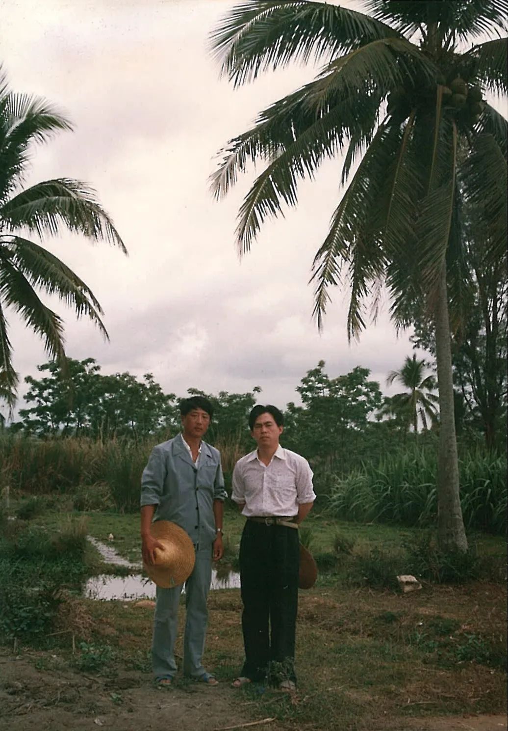 1987年1月,邓兆安(右)在采访李登海时,参观了他在海南的第一个育种基地。