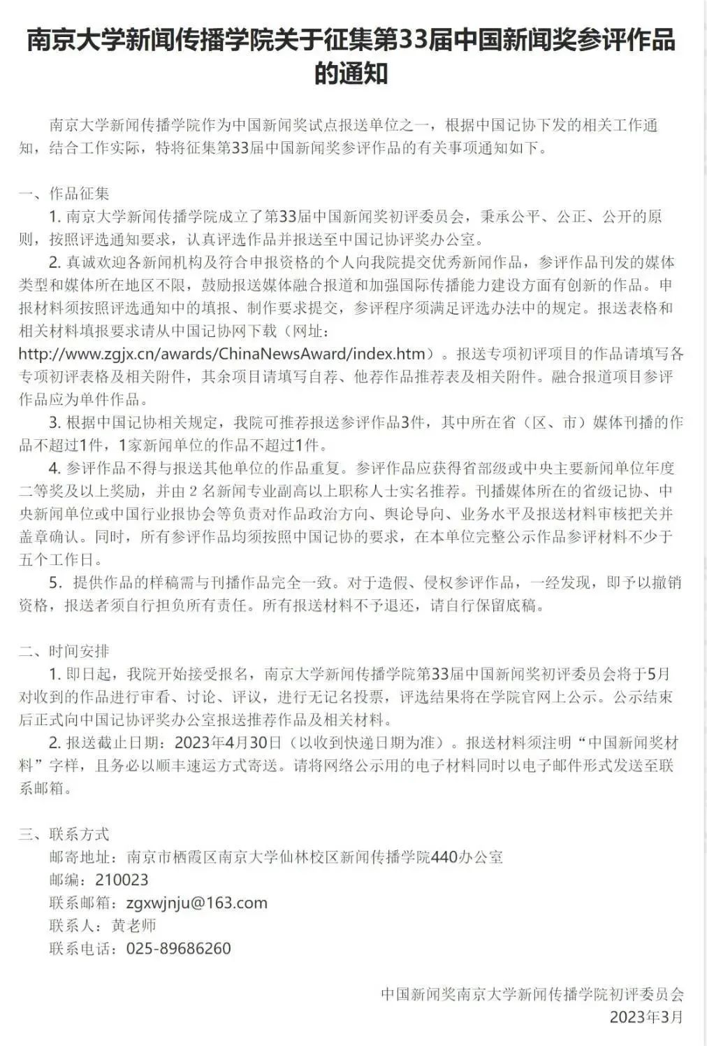 点击查看:南京大学新闻传播学院关于征集第33届中国新闻奖参评作品的通知