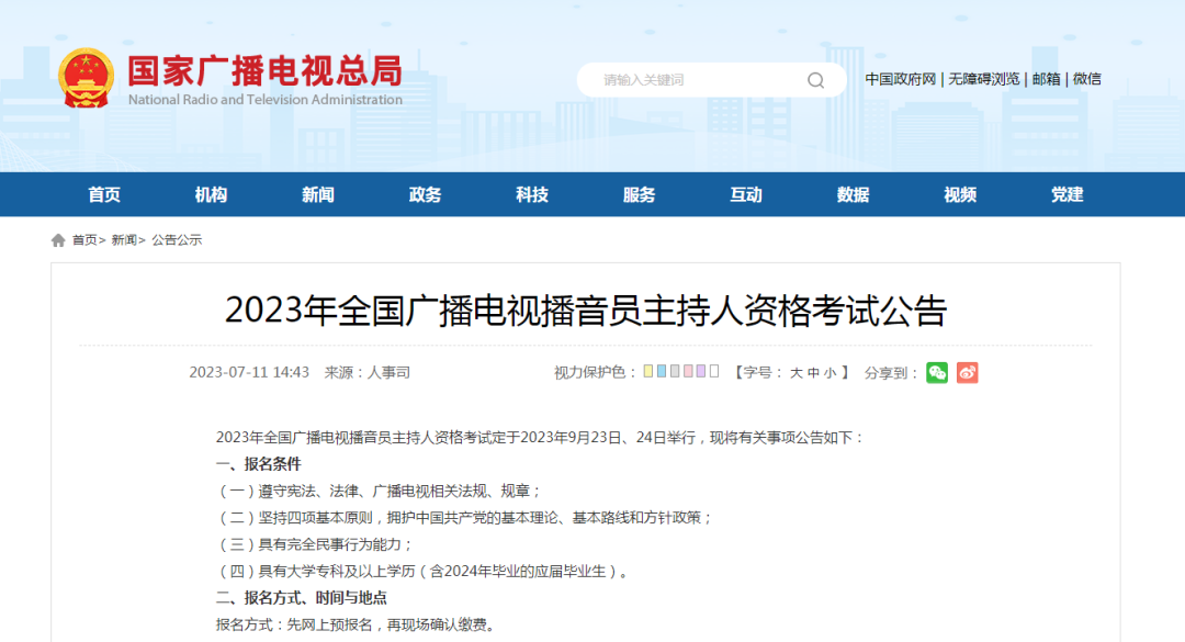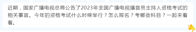 2023年全国广播电视播音员主持人资格考试定于2023年9月23日、24日举行,现将有关事项公告如下: