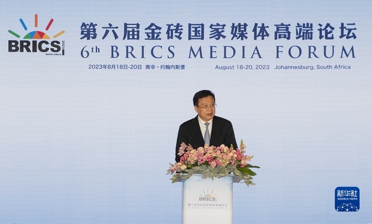 8月19日,在南非约翰内斯堡,金砖国家媒体高端论坛执行主席、新华通讯社社长傅华在开幕式上致辞。新华社记者 张誉东 摄