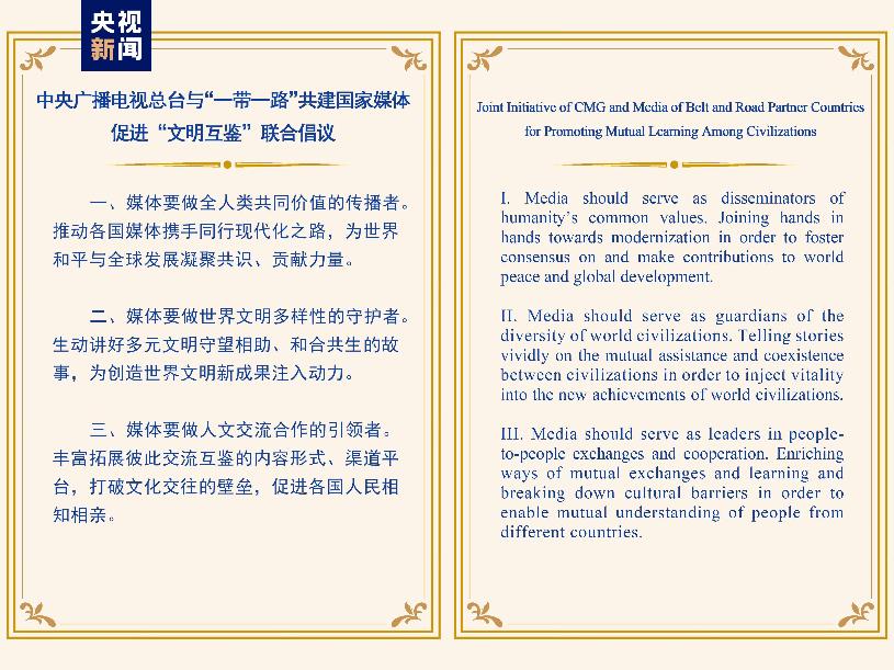 仪式上,发布了《中央广播电视总台与“一带一路”共建国家媒体促进“文明互鉴”联合倡议》,呼吁媒体要做全人类共同价值的传播者、世界文明多样性的守护者、人文交流合作的引领者。