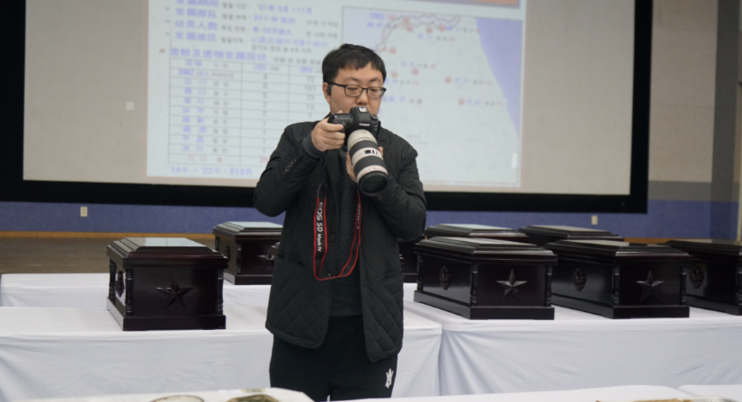 悼念仪式结束后,6名韩方发掘团成员缓步走到陈列志愿军烈士遗骸的桌前,进行装殓。发掘团成员用韩国传统的韩纸小心翼翼地将烈士遗骸包好,整齐地放入棺椁中。据韩国国防部介绍,这些用梧桐木制成的棺椁由中方提供。