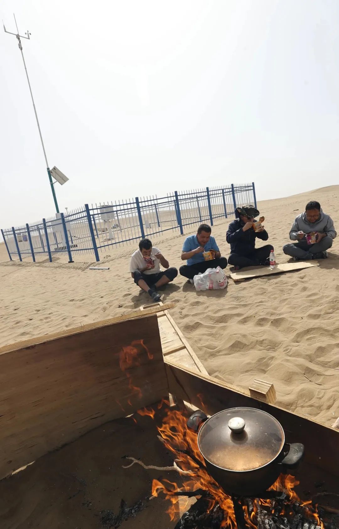 三伏天里,他们在气温超过40℃的沙漠里施工,隔着鞋底,超过50℃的黄沙灼热……每天都有人中暑。