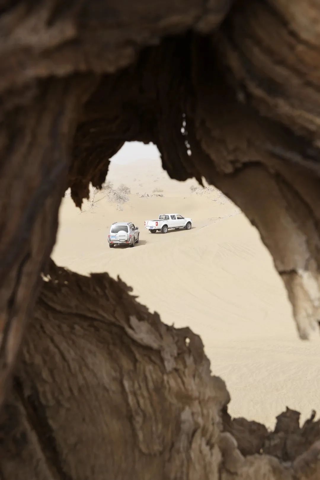 汤博告诉我们,从新村出发前往旧村的120公里路,都在沙山遍布、坑洼不平和陷境丛生的沙漠里,没有固定道路,看起来不远,性能再好的越野车也需要5个小时以上。