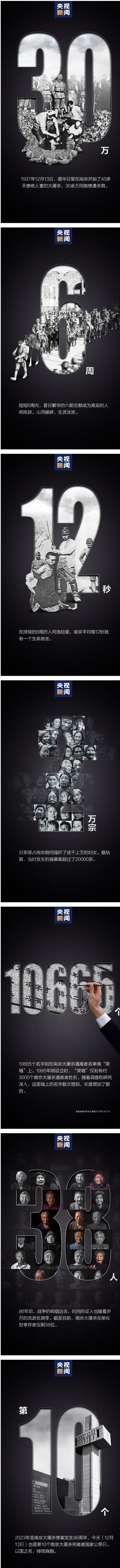 今天(2023年12月13日)是第10个南京大屠杀死难者国家公祭日。86年前,侵华日军制造了惨绝人寰的南京大屠杀,30多万同胞罹难,短短6周内,昔日繁华的古都就变成了人间炼狱,平均每12秒就有一名中国人被杀害……每一个数字,都在提醒着我们,沉痛的记忆,不应随着时间的流逝而湮灭。