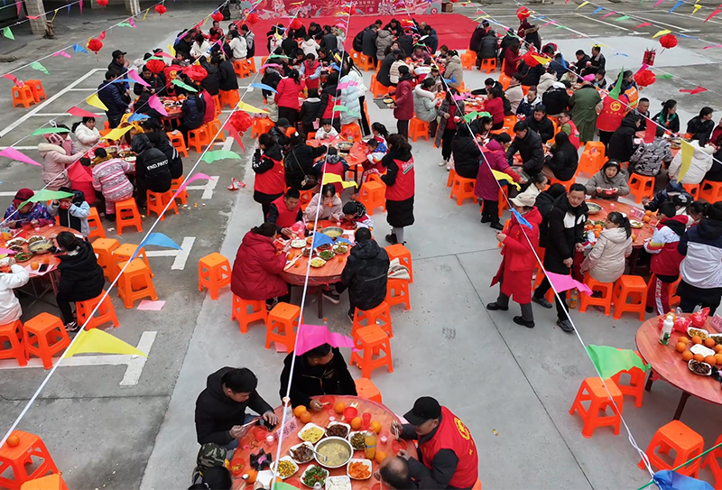 1月26日,江西省共青城市茶山街道城北社区张灯结彩,300多名居民自发地聚在一起,开展了题为“龙腾四海迎新春 敦亲睦邻共欢腾”的百家宴迎春节活动,大家欢聚一堂,共尝“百家宴”,喜迎新春佳节。