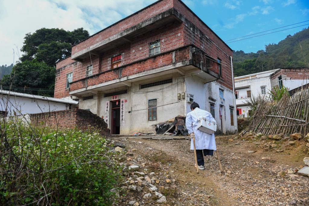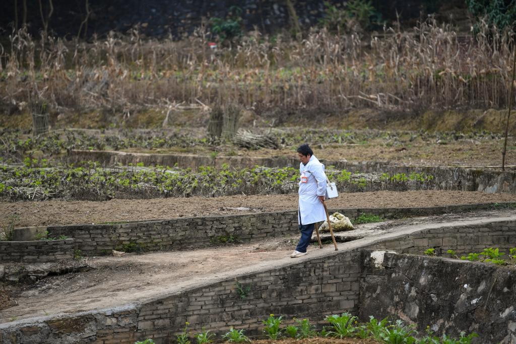 1月31日,在广东省云浮市郁南县东坝镇大迳村,郑仁才背着药箱去五保户叶金元家看诊。