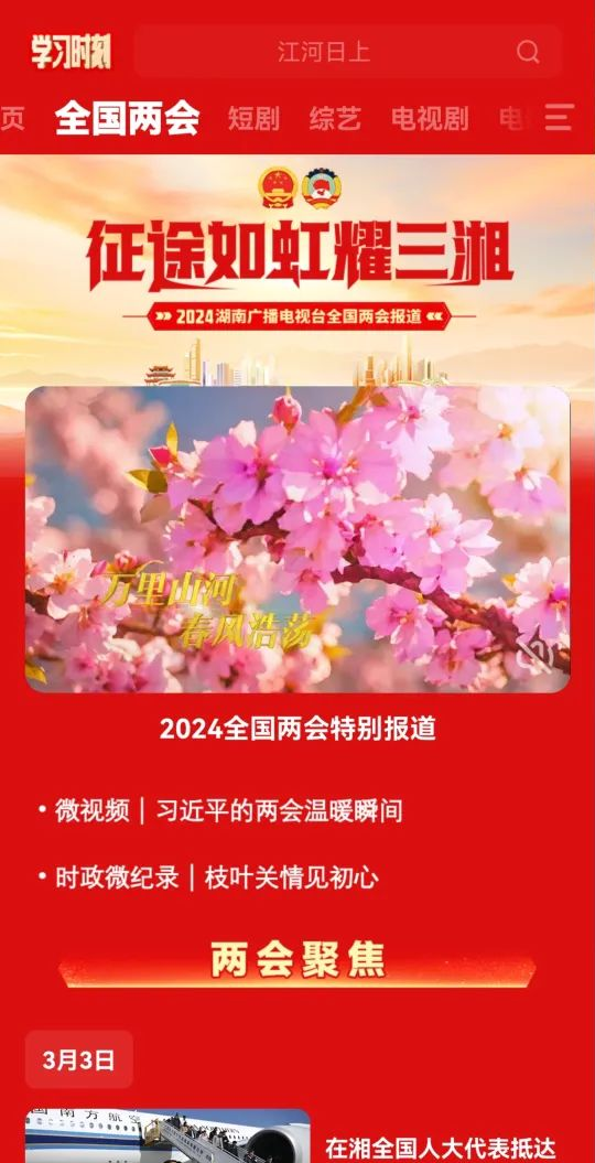 风芒开设《征途如虹耀三湘》《人民的代表》《委员风采》专栏,同时多平台资源整合,融媒体矩阵立体报道,通过云端发送进行二创,“先网后台”第一时间呈现两会代表启程赴京参会全过程,让两会报道有声有色。芒果TV围绕2024全国两会提前布局,于3月3日吹响前哨,在手机端、PC网页端、PC客户端、PAD端置顶飘红醒目推荐,智慧大屏IPTV及OTT端飘红,为两会胜利召开营造良好氛围。新建“2024全国两会综合报道”特辑,上线全国两会子频道、专区和定制专题。APP专区内开设“总书记两会关切事”“人民的代表”“委员风采”等主题版块,通过点播、专题、特辑、纪录片等一系列内容,做精做优主题主线报道。