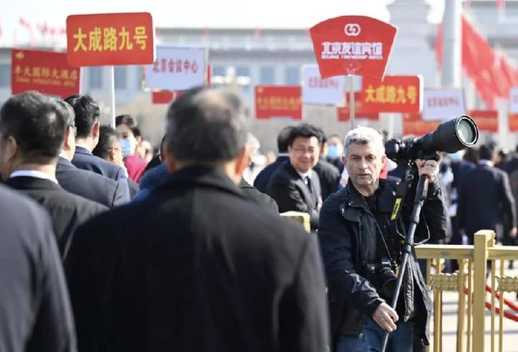 3月4日,洪都拉斯电视台记者从天安门广场步入人民大会堂时,用手机录制视频素材。新华社记者 宋为伟 摄