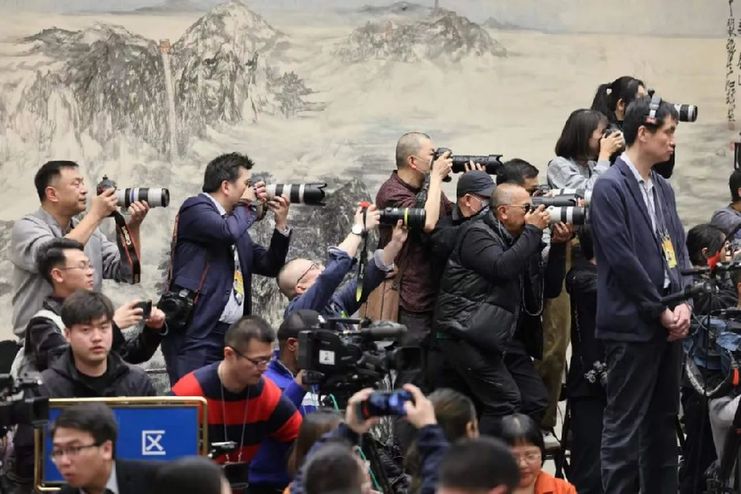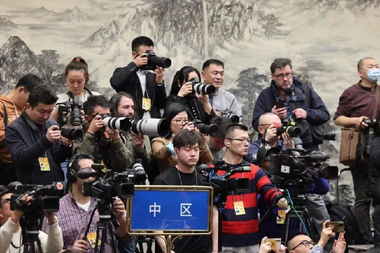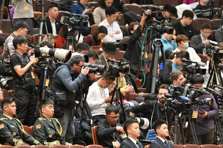 3月7日,媒体记者在北京梅地亚中心采访记者会。新华社记者 才扬 摄