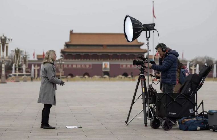 这是3月4日,政协开幕前一家国外电视台记者在天安门广场拍摄。新华社记者 费茂华 摄
