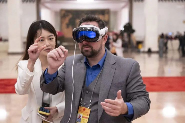 3月5日,媒体记者在人民大会堂试用 vr 眼镜阅读新闻。新华社记者 才扬 摄
