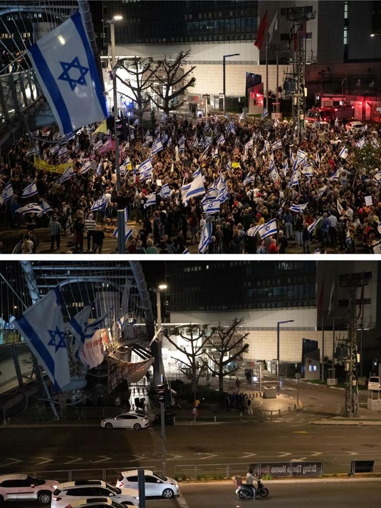 这张拼版照片显示,上图:4月13日晚,在以色列特拉维夫的以色列国防部前,民众在安全警告生效前举行示威集会;下图:4月13日晚,在以色列特拉维夫的以色列国防部前参加示威集会的民众在安全警告生效后散去。以色列13日晚发布安全警告,要求以色列全国各地的学校在未来48小时停止教学活动,并对聚集活动加以限制。