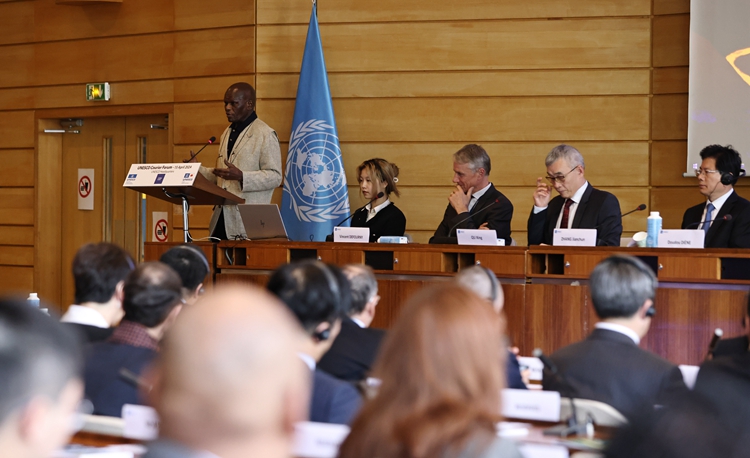 图片4月15日,在位于法国巴黎的联合国教科文组织总部,联合国教科文组织跨文化对话部门前主任杜杜·迪安(后左一)在“文明交流互鉴理念国际研讨会”上作主旨发言。