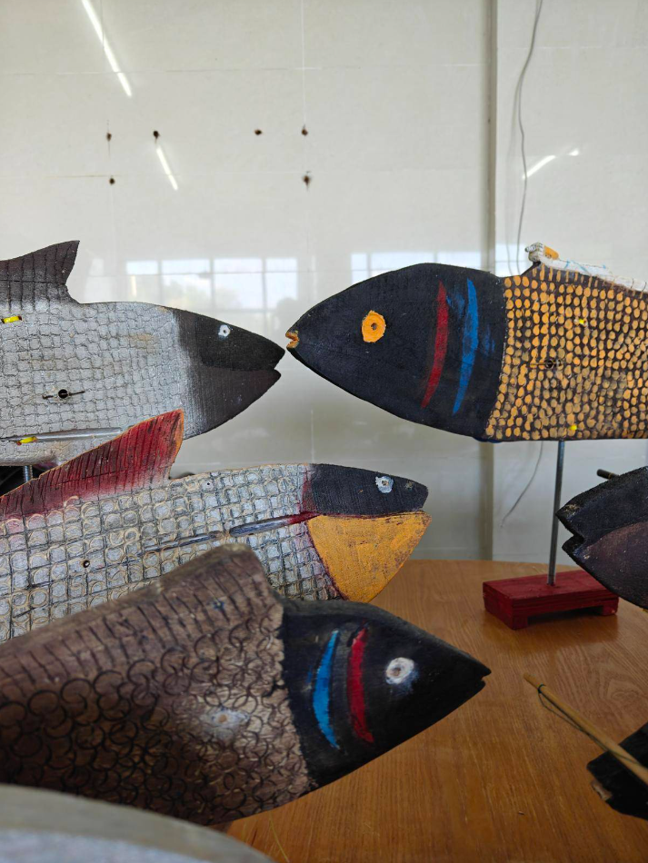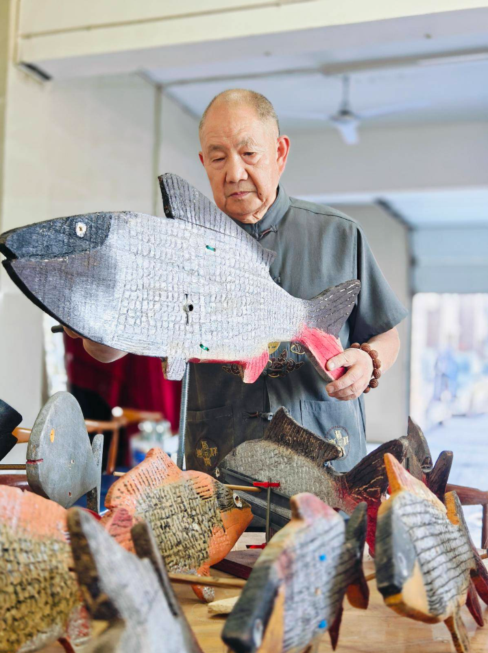 “那个时候,葛洲坝上生活的都是船家,全靠种菜和跑船为生。大人们找来木板,用锯子和刀制作成鱼的形状,哄孩子开心。”78岁的邹开林边整理制作的木鱼,边回忆儿时画面。