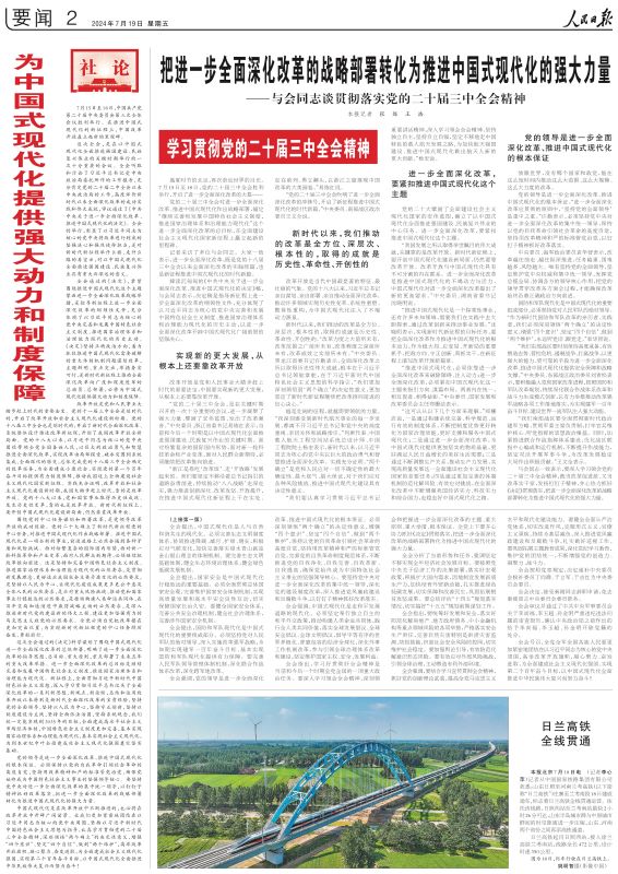 7月19日人民日报在头版刊发党的二十届三中全会公报,推出社论《为中国式现代化提供强大动力和制度保障》,并连续推出本报评论员文章,推动学习贯彻全会精神。专栏“学习贯彻党的二十届三中全会精神”,连续刊发与会代表、中央和国家机关、港澳台同胞等学习全会精神的认识体会。