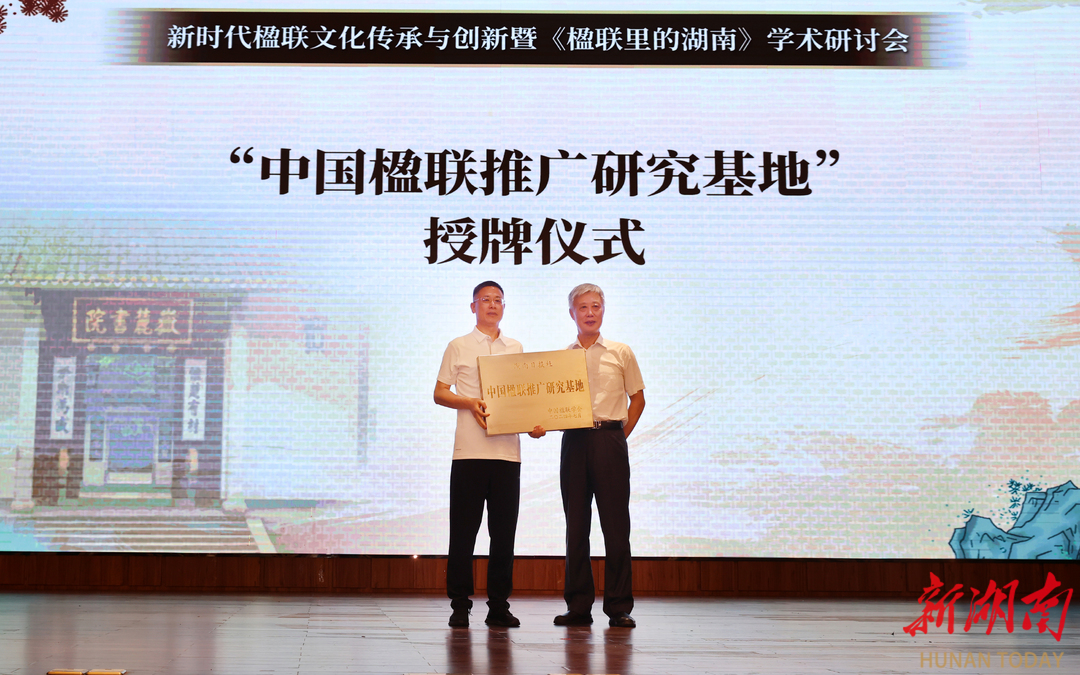 在7月28日上午举行的“新时代楹联文化传承与创新暨《楹联里的湖南》学术研讨会”上,中国楹联学会授予湖南日报社“中国楹联推广研究基地”称号。据悉这是中国楹联学会颁布的首个楹联推广研究基地,湖南日报社同时也成为中国楹联学会首个媒体会员单位。